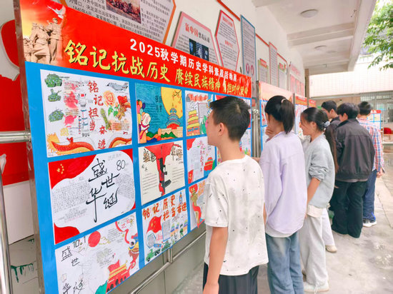作品完成后,歷史組老師們利用休息時間,對優(yōu)秀作品進(jìn)行了篩選和整理,并精心設(shè)計、布置了專題展板。展板一經(jīng)展出便吸引了眾多師生駐足觀看。課間時分,同學(xué)們或凝神細(xì)讀,或低聲交流,在一筆一畫、一文一圖中感受歷史的厚重與民族的堅韌。這道獨(dú)特的“風(fēng)景線”,不僅美化了校園環(huán)境,更營造了“時時受教育,處處受熏陶”的濃厚學(xué)習(xí)氛圍,讓歷史知識“活”了起來,讓民族精神“立”了起來。