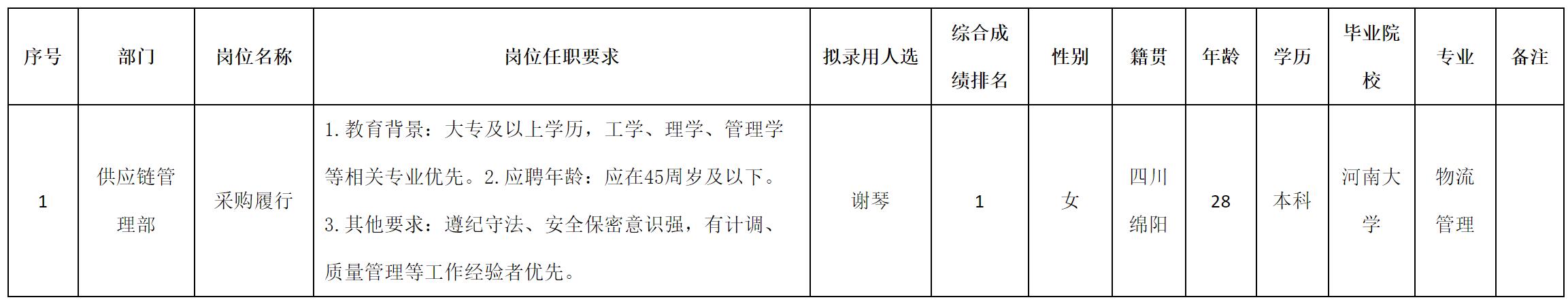 根據(jù)四川九州電子科技股份有限公司發(fā)布的招聘公告及招聘相關(guān)規(guī)定,經(jīng)測試、考察、體檢等程序,擬錄用謝琴同志到四川九州電子科技股份有限公司工作,現(xiàn)予以公示,具體情況如下:
