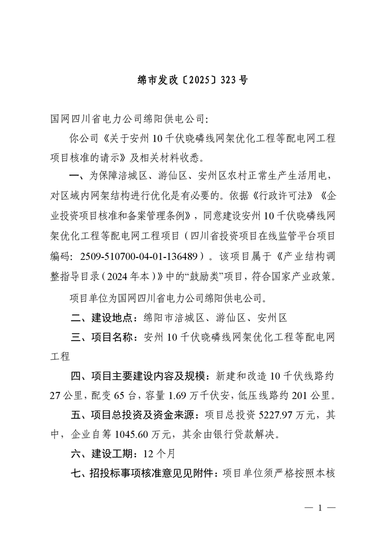 綿陽市發(fā)展和改革委員會關(guān)于安州10千伏曉磷線網(wǎng)架優(yōu)化工程等配電網(wǎng)工程項目核準(zhǔn)的批復(fù)