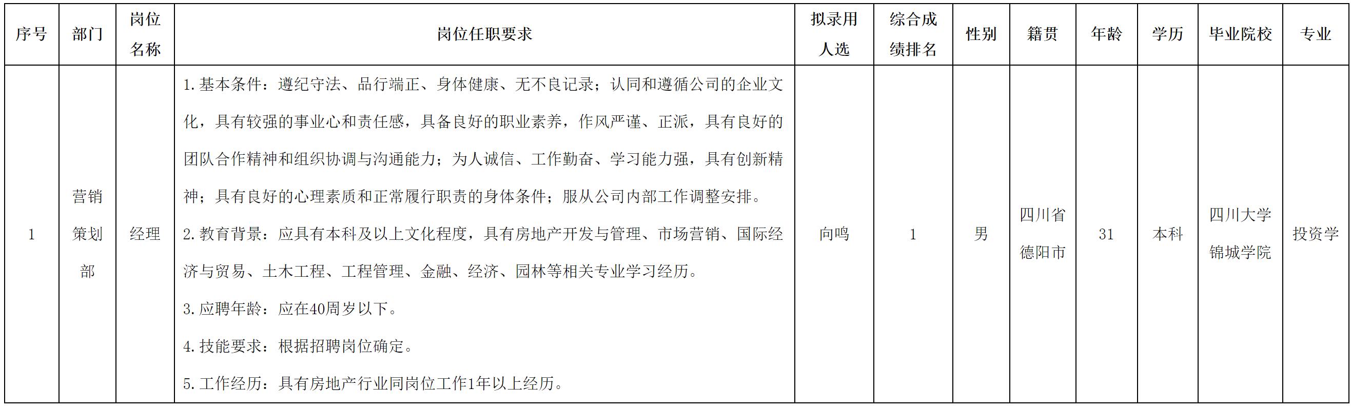 根據(jù)四川波鴻實(shí)業(yè)有限公司發(fā)布的招聘公告及招聘相關(guān)規(guī)定,經(jīng)面試、體檢等程序,擬錄用向鳴同志到綿陽萬鴻房地產(chǎn)開發(fā)有限公司工作,現(xiàn)予以公示,具體情況如下: