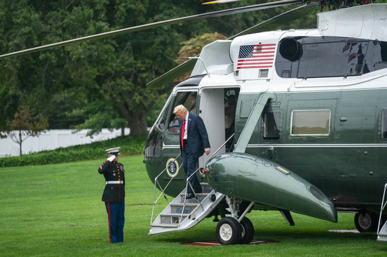 9月30日,在美國(guó)首都華盛頓,美國(guó)總統(tǒng)特朗普乘直升機(jī)返抵白宮。新華社記者胡友松攝