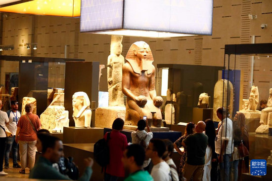 10月14日,游客在位于埃及吉薩省的大埃及博物館參觀。