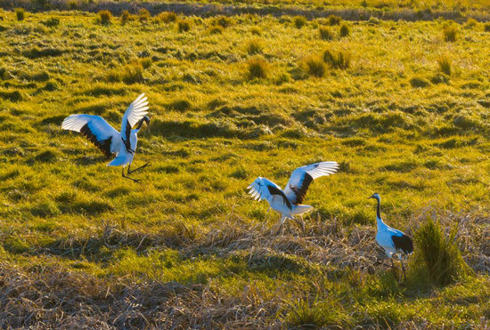 10月9日,在黑龍江撓力河國家級自然保護區(qū),丹頂鶴在濕地中活動(無人機照片)。