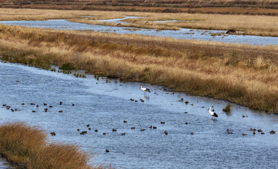 10月14日在黑龍江省同江市三江口國家濕地公園拍攝的東方白鸛和野鴨(無人機照片)。