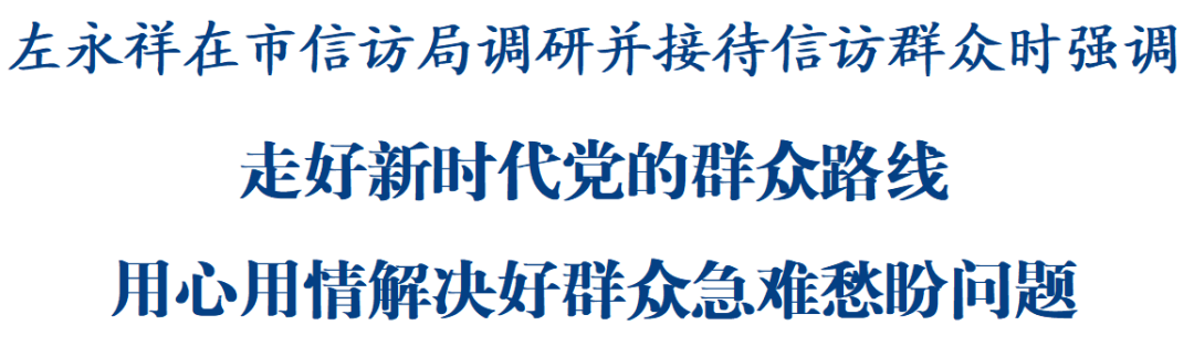 來到市信訪局,左永祥走進人民群眾來訪接待中心,聽取全市信訪工作情況匯報,察看中心運行情況,詳細了解群眾來訪接待、事項辦理等具體流程,并與工作人員親切交談,叮囑大家要始終站穩(wěn)群眾立場,把群眾當家人、把群眾事當家事,真實了解把握群眾所思所想所憂所盼,解決好群眾合理訴求;要求中心加強資源整合,優(yōu)化工作機制,推動政策完善、作風(fēng)轉(zhuǎn)變、效能提升,更好地為群眾服務(wù)。隨后,左永祥來到接訪室,認真傾聽群眾反映的問題,詢問有關(guān)情況,現(xiàn)場分析問題癥結(jié)、研究解決方案,耐心細致為群眾答疑解惑,要求有關(guān)方面加強統(tǒng)籌聯(lián)動,強化跟蹤督辦,依法依規(guī)推動問題限期解決;同時堅持舉一反三,排查化解共性問題,努力做到以“一件事”帶動“一類事”解決,更好維護人民群眾合法權(quán)益。