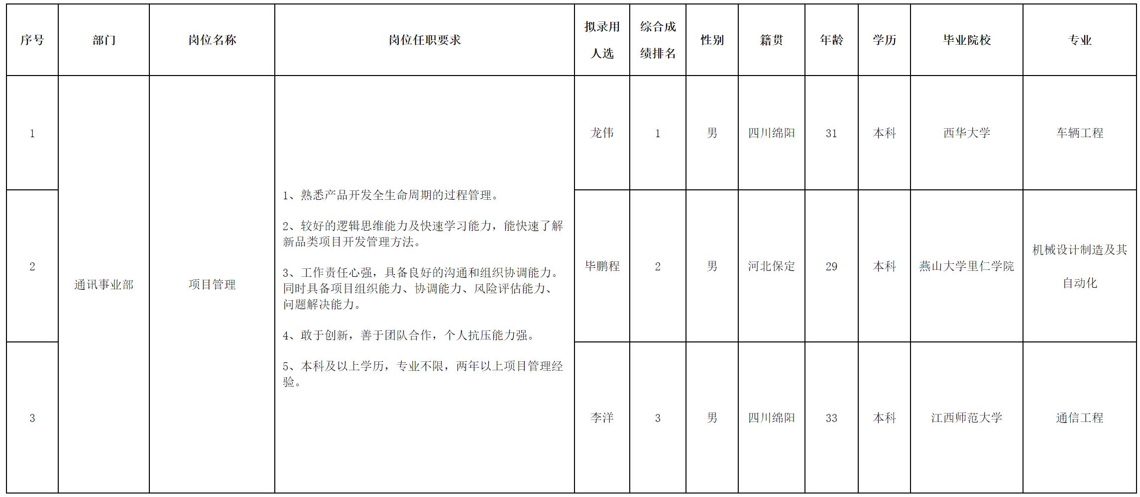 根據(jù)四川華豐科技股份有限公司發(fā)布的招聘公告及招聘相關(guān)規(guī)定,經(jīng)測試等程序,擬錄用龍偉等同志到四川華豐科技股份有限公司工作,現(xiàn)予以公示,具體情況如下: