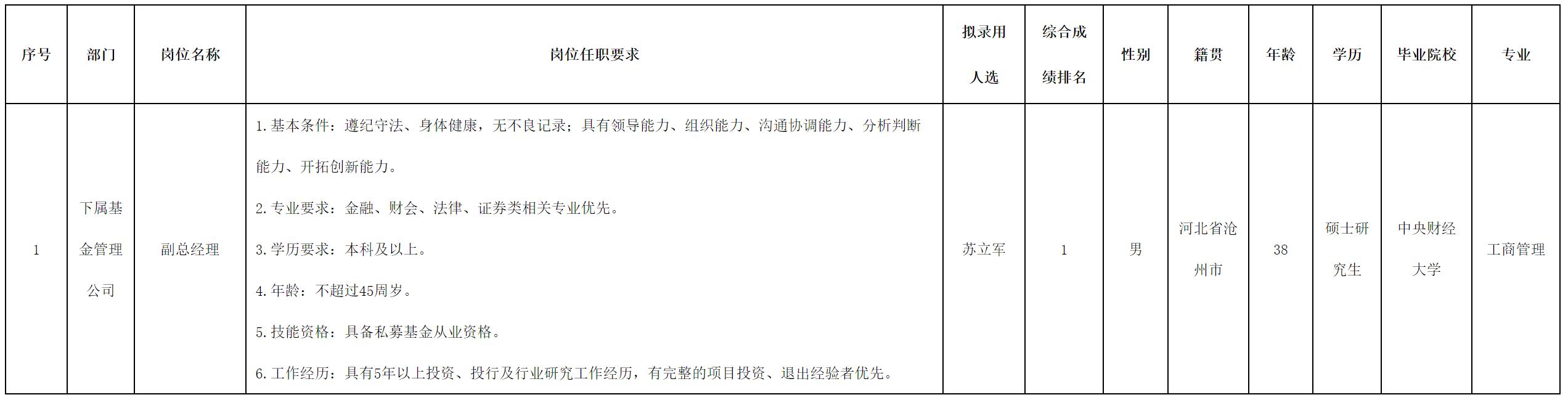 根據(jù)四川長(zhǎng)虹創(chuàng)新投資有限公司發(fā)布的招聘公告及招聘相關(guān)規(guī)定,經(jīng)面試、考察等程序,擬錄用蘇立軍同志到公司工作,現(xiàn)予以公示,具體情況如下: