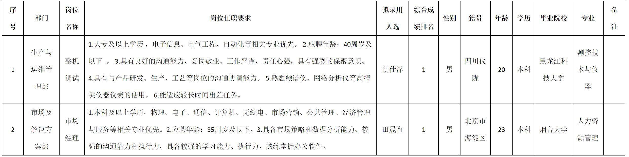 根據(jù)四川九洲防控科技有限責(zé)任公司發(fā)布的招聘公告及招聘相關(guān)規(guī)定,經(jīng)測試、考察、體檢等程序,擬錄用胡仕澤等2名同志到四川九洲防控科技有限責(zé)任公司工作,現(xiàn)予以公示,具體情況如下: