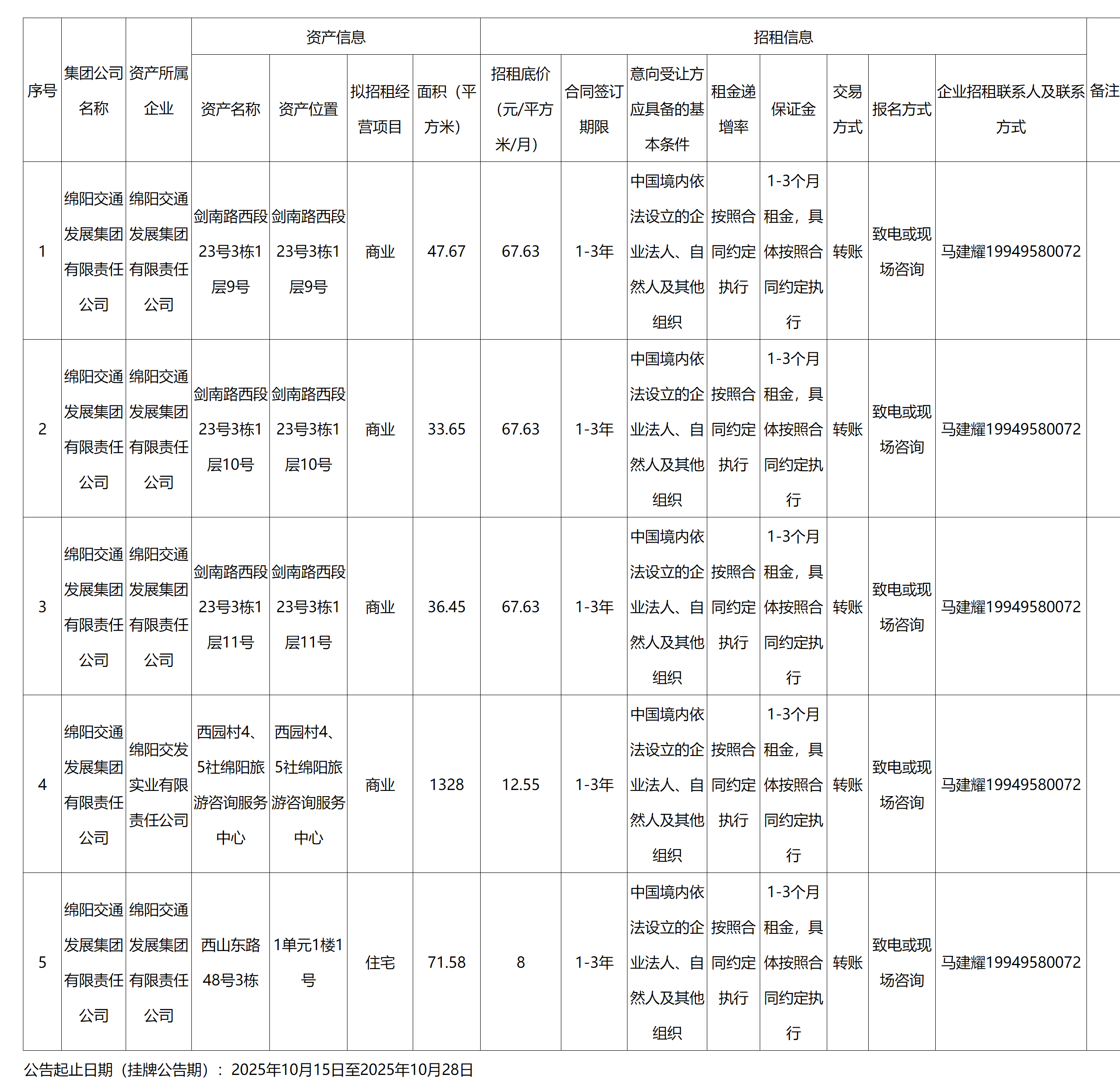 綿陽(yáng)交發(fā)實(shí)業(yè)有限責(zé)任公司市區(qū)內(nèi)部分資產(chǎn)招租公告