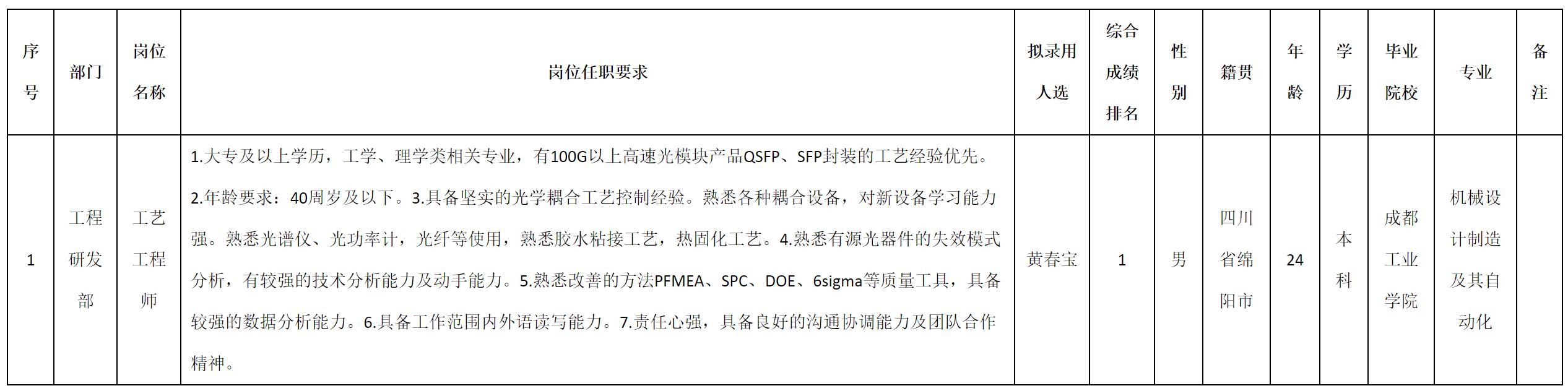 根據(jù)四川九華光子通信技術(shù)有限公司發(fā)布的招聘公告及招聘相關(guān)規(guī)定,經(jīng)測(cè)試、考察、體檢等程序,擬錄用黃春寶同志到四川九華光子通信技術(shù)有限公司工作,現(xiàn)予以公示,具體情況如下: