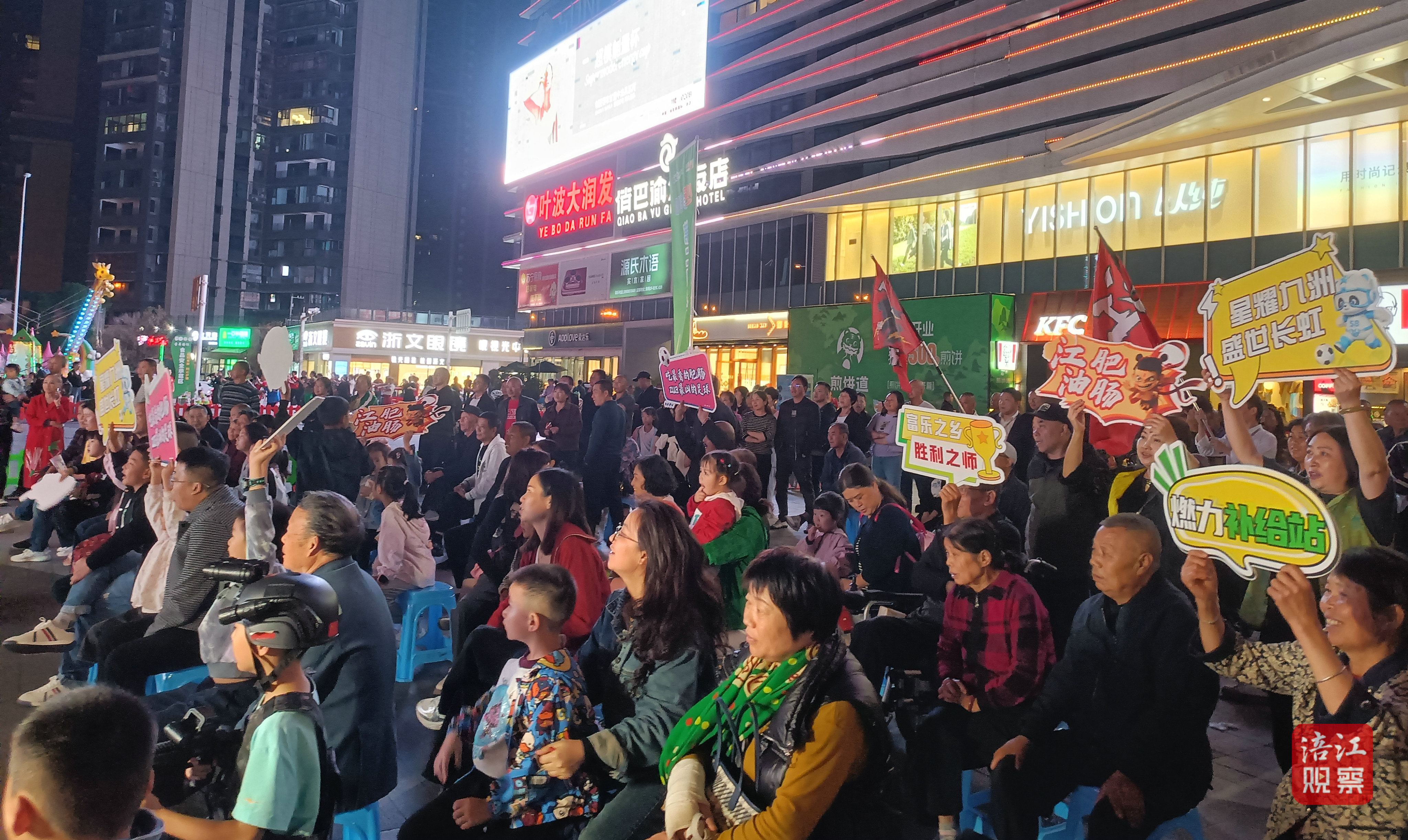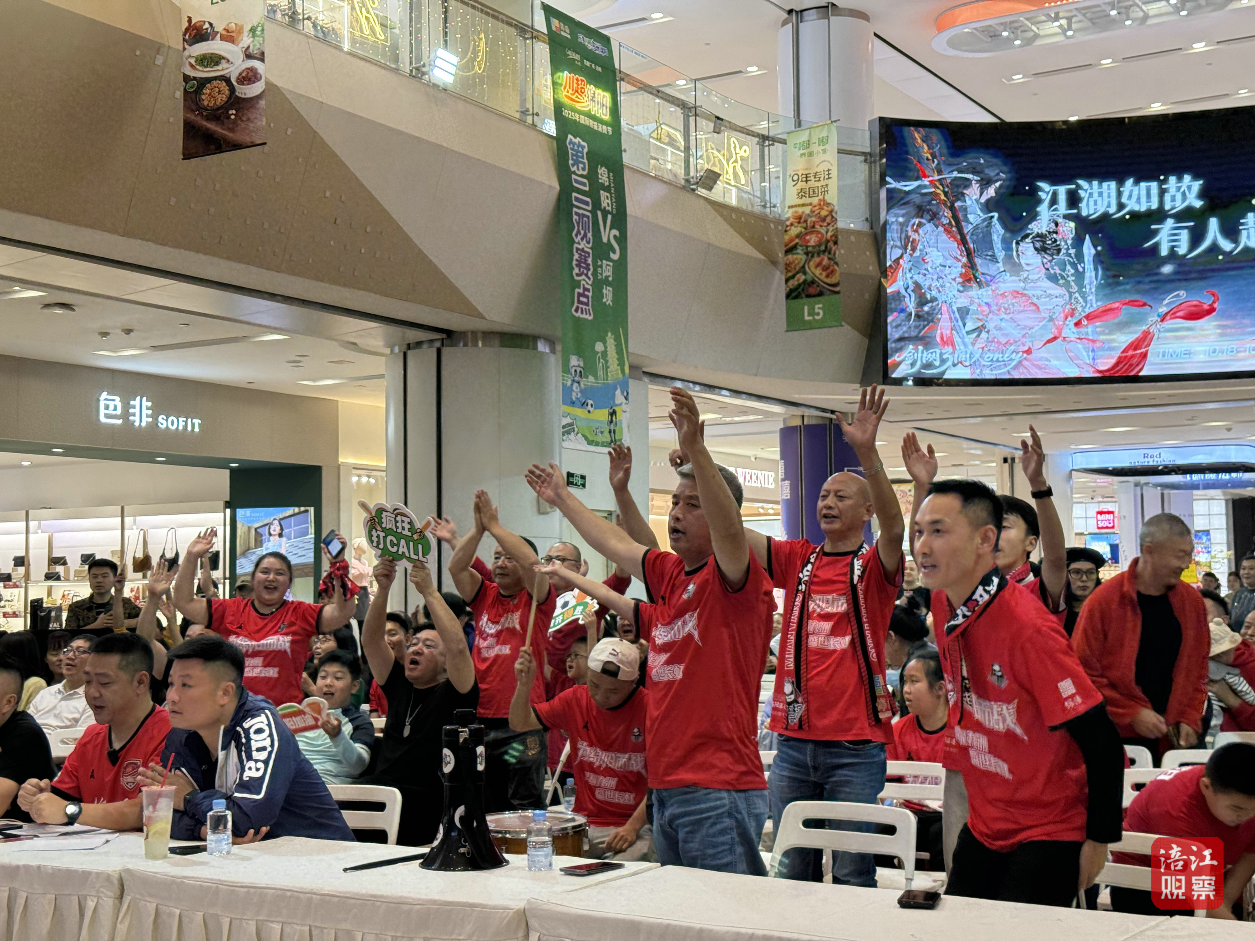 傍晚時(shí)分,球迷早早來到圣名國際購物廣場(chǎng)第二觀賽點(diǎn),手持應(yīng)援牌,通過大屏幕為綿陽隊(duì)加油。