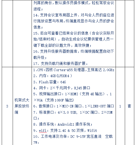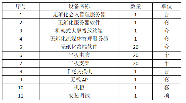 為持續(xù)推動節(jié)約型機(jī)關(guān)創(chuàng)建,實現(xiàn)辦會安全可靠、智慧高效、經(jīng)濟(jì)環(huán)保,現(xiàn)需采購一批無紙化會議室配套設(shè)施設(shè)備,用于日常會務(wù)使用。