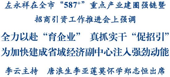 左永祥在講話中指出,今年以來,我們把推進重點產(chǎn)業(yè)建圈強鏈作為以科技創(chuàng)新引領產(chǎn)業(yè)創(chuàng)新、加快發(fā)展新質(zhì)生產(chǎn)力、扎實推進高質(zhì)量發(fā)展的重要著力點和突破口,把產(chǎn)業(yè)建圈強鏈行動作為“八大行動”之一擺在重要位置來抓,推動工作機制和推進模式不斷完善,圍繞產(chǎn)業(yè)鏈招商引資工作取得了積極進展,相關工作開局有力、起勢良好。全市上下要保持發(fā)展定力,創(chuàng)新思路舉措,以建圈強鏈為引領、“587+”產(chǎn)業(yè)體系為方向,以“拼”的姿態(tài)、“實”的作風,抓緊抓實招商引資工作,持續(xù)強鏈主、聚鏈屬、延鏈條,不斷提升我市現(xiàn)代化產(chǎn)業(yè)體系發(fā)展能級和水平。