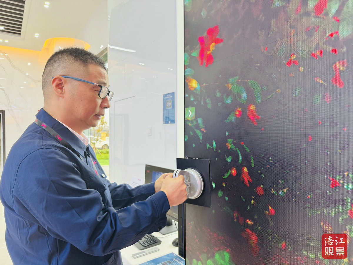 一樓的展廳內(nèi),136寸的一體機(jī)更是引人注目。“這是由無(wú)數(shù)塊8寸的Mini-LED模塊組成,采用獨(dú)特的前維護(hù)設(shè)計(jì),就像拼樂(lè)高一樣,哪塊壞了,直接用專業(yè)吸盤(pán)工具取下來(lái)更換即可,大大降低了維護(hù)成本和時(shí)間。”蔡遠(yuǎn)橋介紹,讓這項(xiàng)高技術(shù)工藝變得直觀可感。