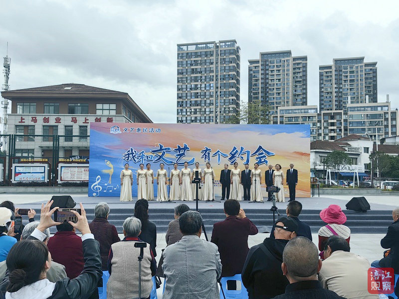 15時(shí),在歡快的旋律中,舞蹈《起舞》為當(dāng)天的惠民演出啟幕。在音舞相伴的氛圍中,不斷有居民被吸引過來。舞臺風(fēng)格切換,合唱《萬疆》登臺,聽到熟悉的旋律,不少觀眾和著節(jié)拍輕輕哼唱。