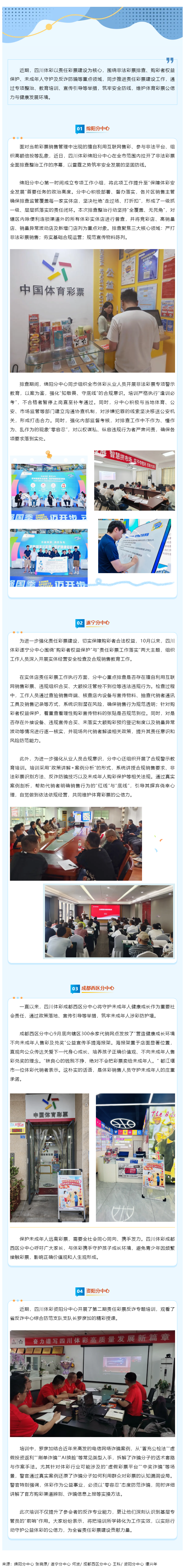 近期,四川體彩以責任彩票建設(shè)為核心,圍繞非法彩票排查、購彩者權(quán)益保護、未成年人守護及反詐防騙等重點領(lǐng)域,同步推進責任彩票建設(shè)工作,通過專項整治、教育培訓、宣傳引導等舉措,筑牢安全防線,維護體育彩票公信力與健康發(fā)展環(huán)境。
