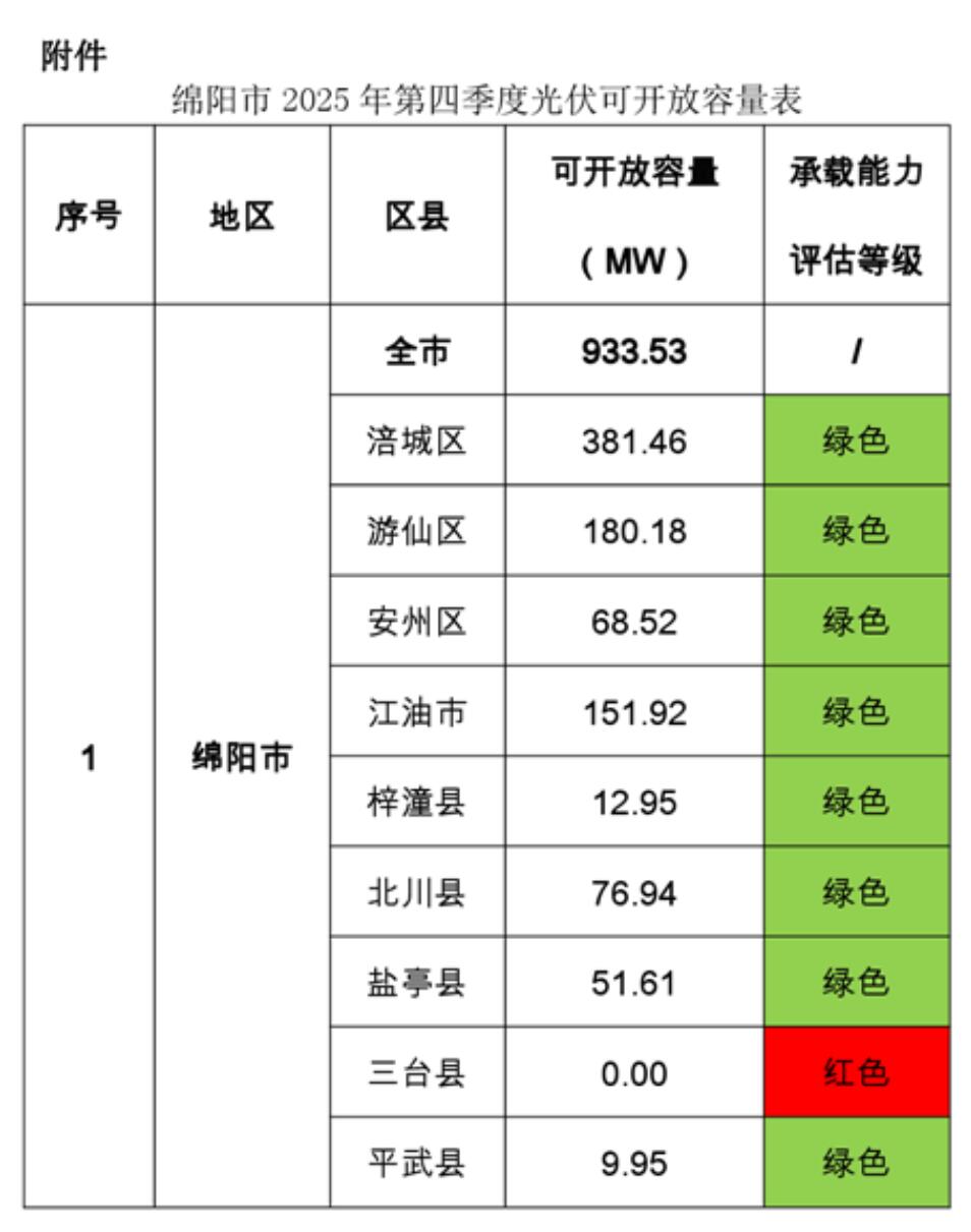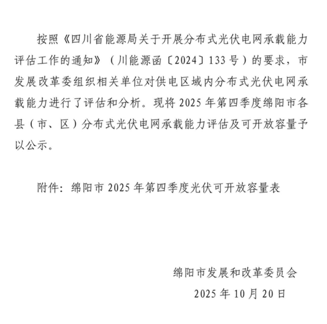 綿陽市發(fā)展和改革委員會關(guān)于對2025年第四季度分布式光伏電網(wǎng)承載能力評估及可開放容量的公示
