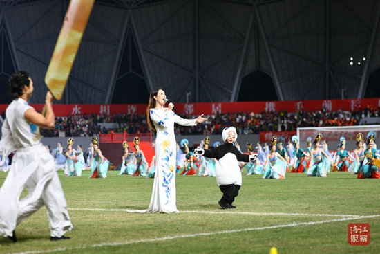 伴隨著歡樂(lè)的音樂(lè),數(shù)十個(gè)超大型充氣足球瞬間涌入綠茵場(chǎng),花式足球表演、人偶互動(dòng)表演等穿插進(jìn)行,全場(chǎng)立刻化為一個(gè)夢(mèng)幻的足球樂(lè)園,用最純粹、最歡樂(lè)的方式,展現(xiàn)綿陽(yáng)深入血脈的足球熱情與代代相傳的體育精神。