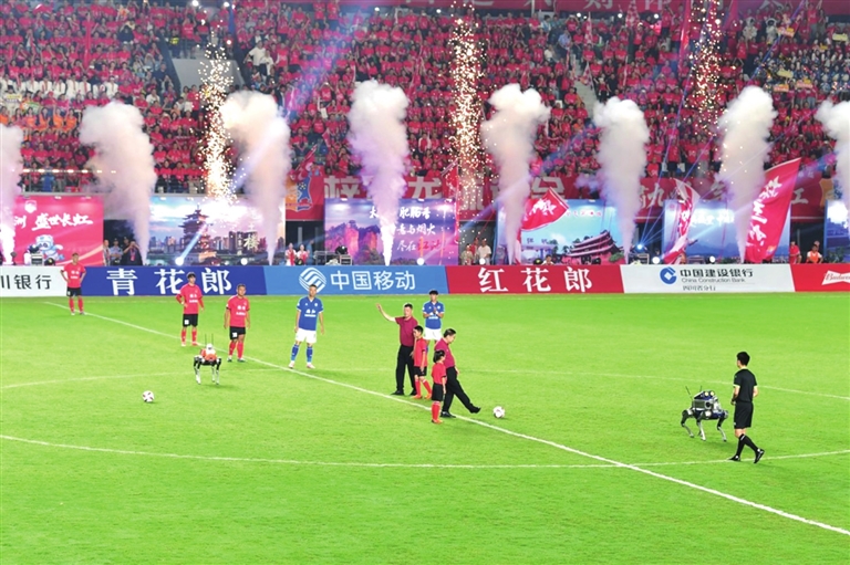 其一,“在地性”極強(qiáng)。舉個(gè)例子,10月7日的川超綿陽主場開幕式上,開球嘉賓搭乘的無人駕駛公交車、現(xiàn)場迎賓的長虹機(jī)器人、裝載比賽用球的“機(jī)器狼”,均出自綿陽本地企業(yè)或本地科研成果。很顯然,這種本地化科技裝備與紅色文化、體育競技的結(jié)合,既避免了“外來科技”的違和感,又進(jìn)一步彰顯了“科技城”的定位,由此帶給游客和市民的獨(dú)特體驗(yàn)感,是一般城市所無法比擬的。