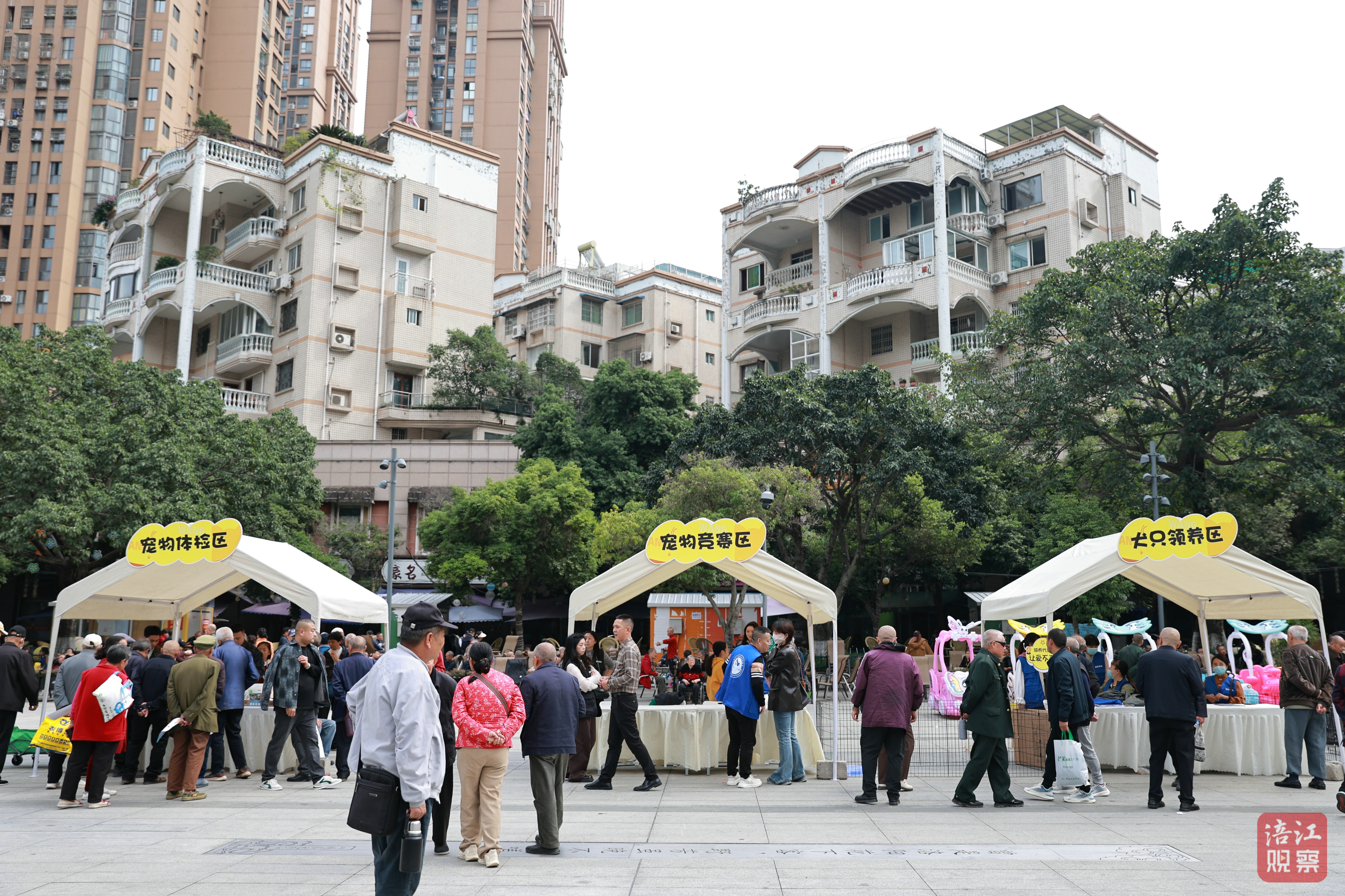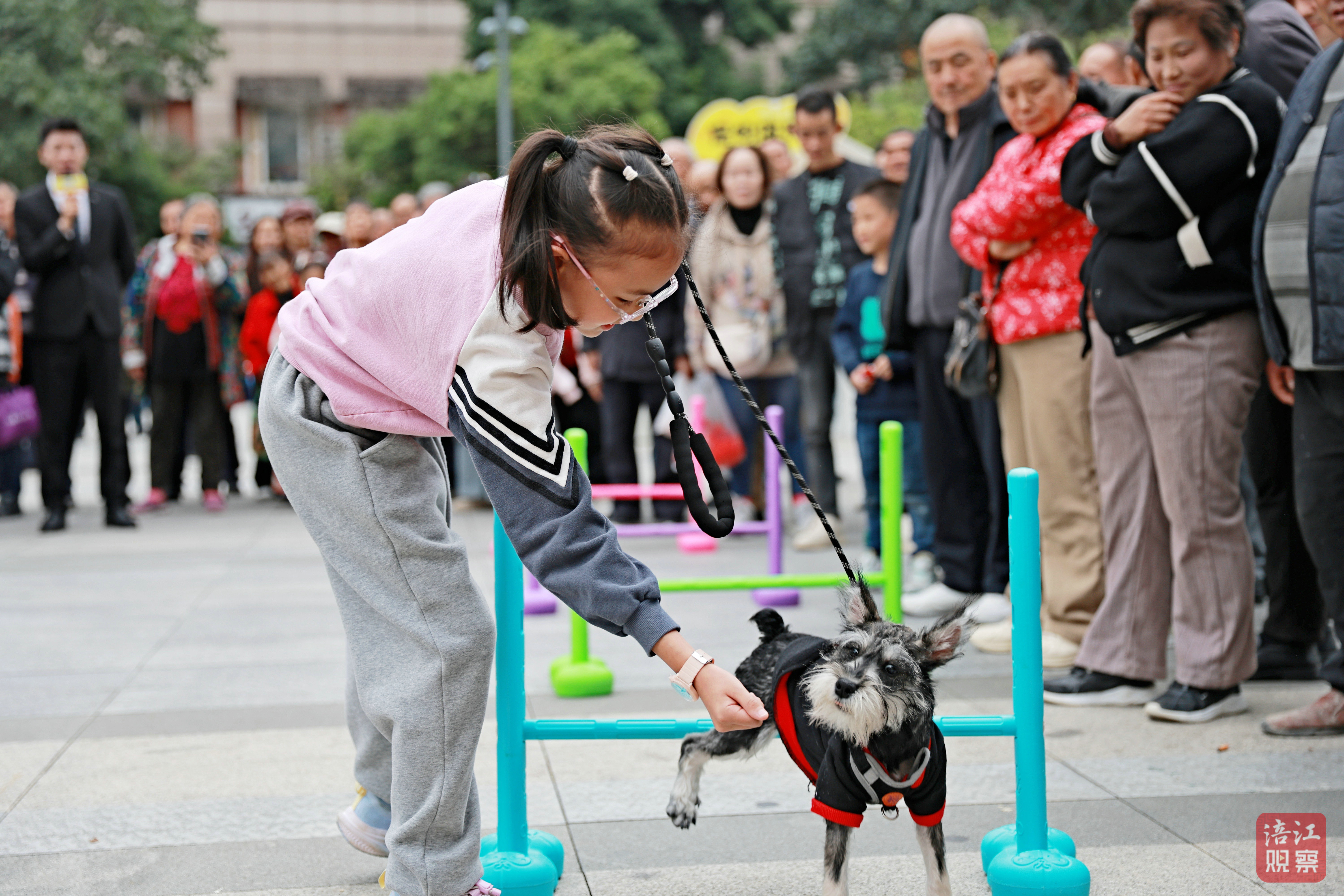 鐵牛廣場兩側(cè)還設(shè)置了養(yǎng)犬宣傳辦證區(qū)、寵物體檢區(qū)、流浪犬領(lǐng)養(yǎng)區(qū)等多個區(qū)域,市民們通過問答互動或拍照打卡領(lǐng)取寵物零食、環(huán)保袋等禮品,萌寵比賽中,狗狗在主人引導(dǎo)下穿越障礙,場面歡樂。
