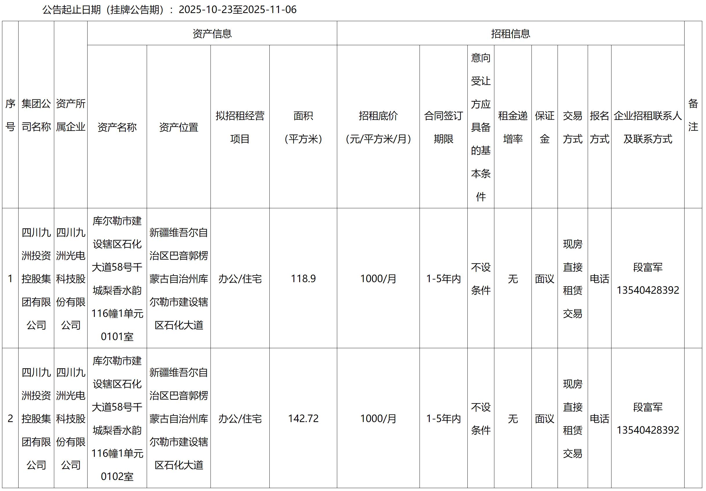四川九洲光電科技股份有限公司資產(chǎn)出租公告