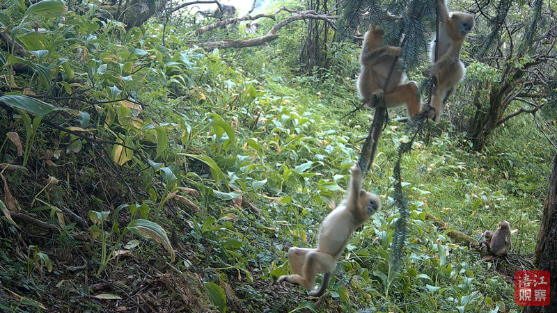 ◆川金絲猴幼崽們成“串”掛在枝丫上嬉戲,反映出種群繁衍的活力以及對(duì)棲息地環(huán)境的高度信任。
