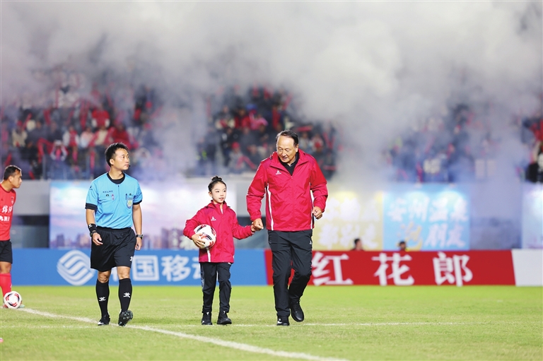 10月25日晚,川超聯(lián)賽綿陽九洲長(zhǎng)虹隊(duì)主場(chǎng)對(duì)陣廣元?jiǎng)﹂T雄關(guān)隊(duì)。圖為開球嘉賓李日新(右)步入賽場(chǎng)。 記者 陳冬冬 攝