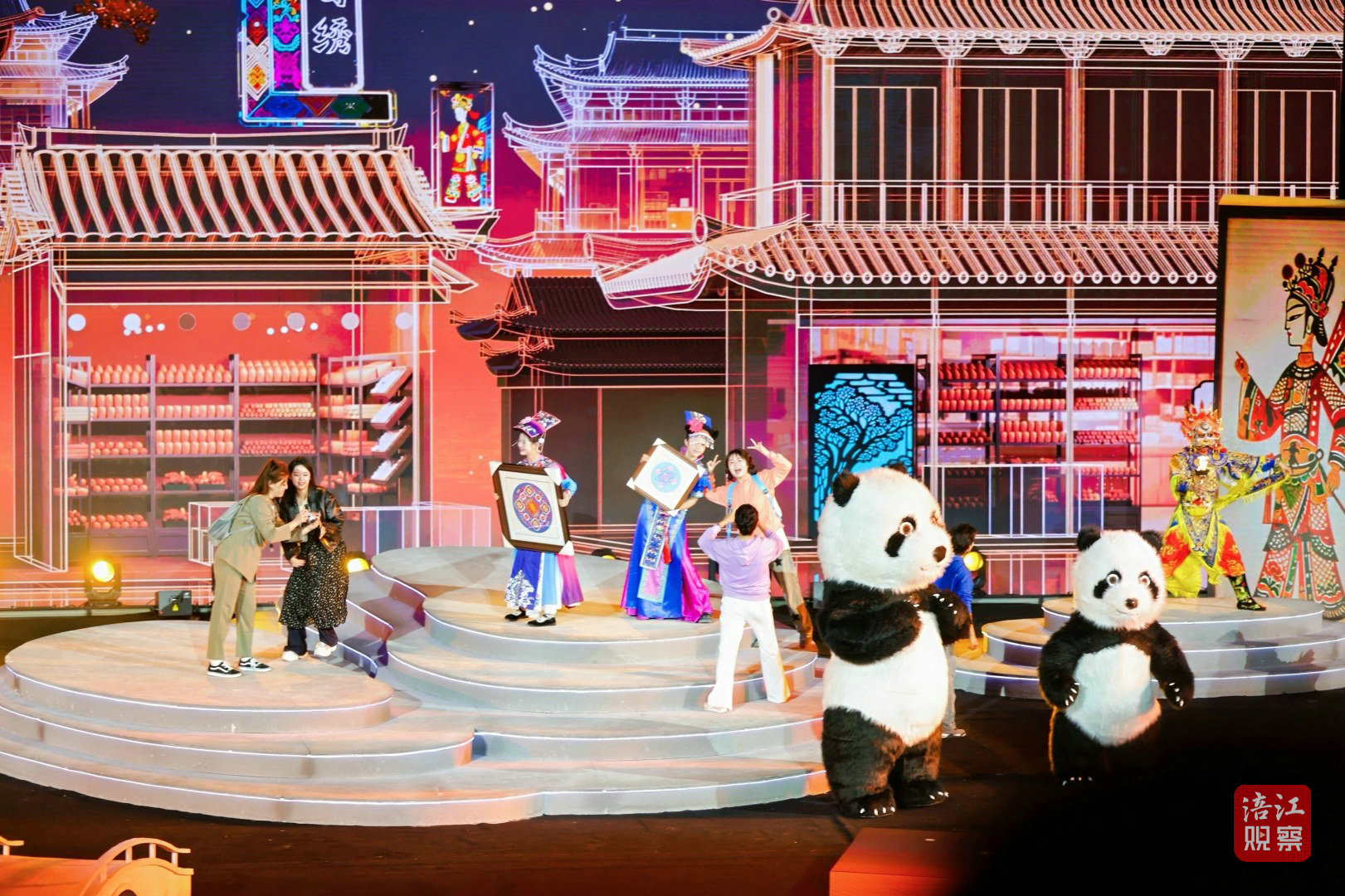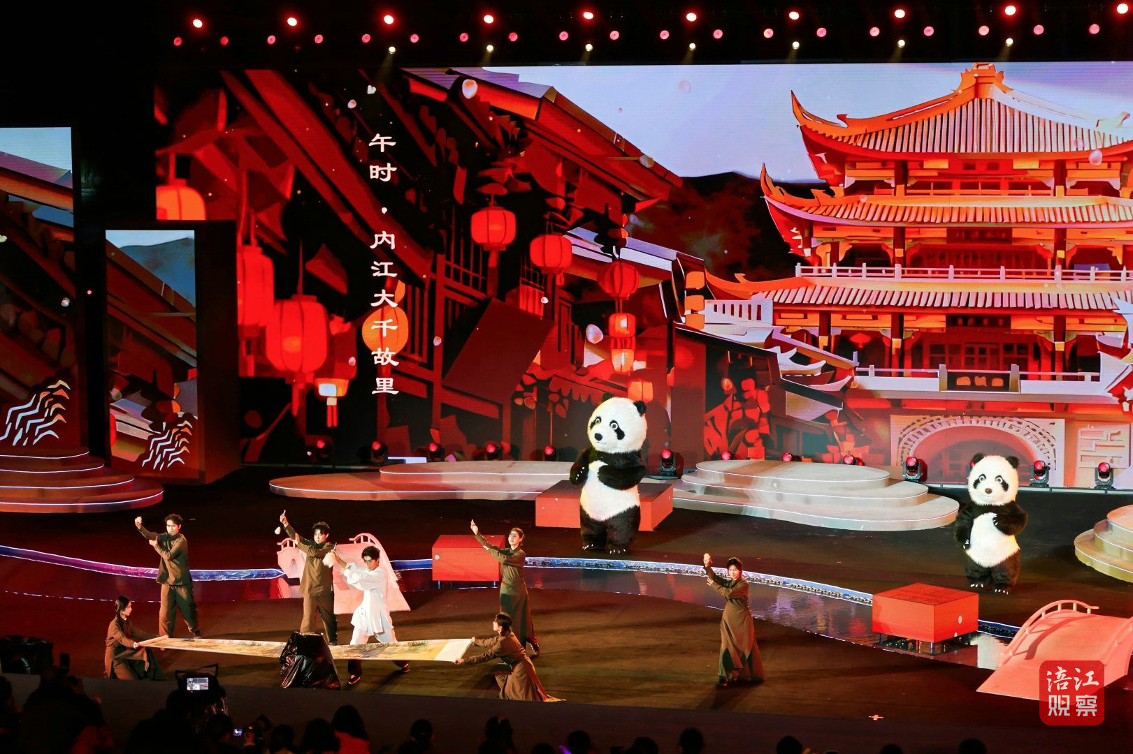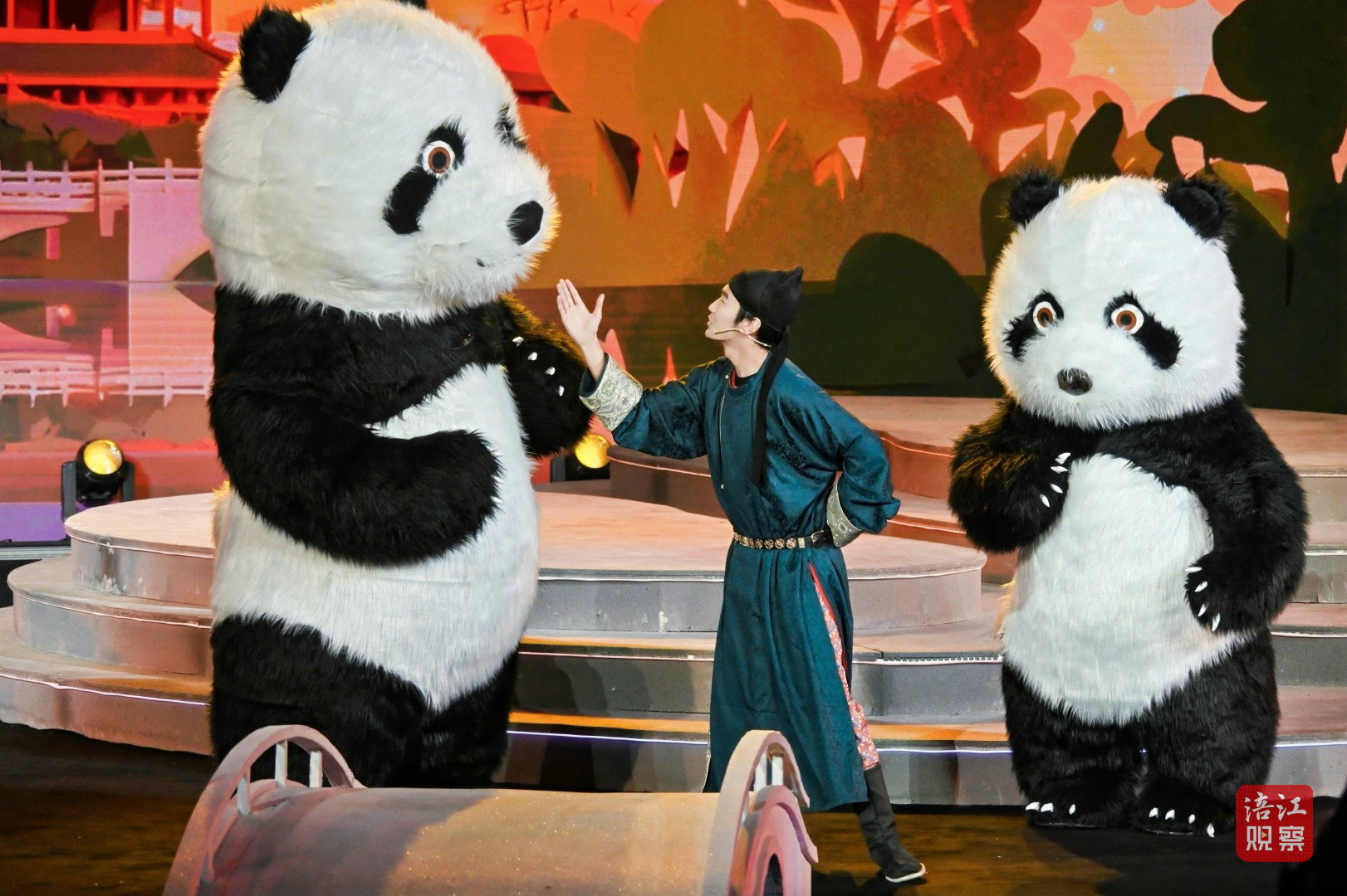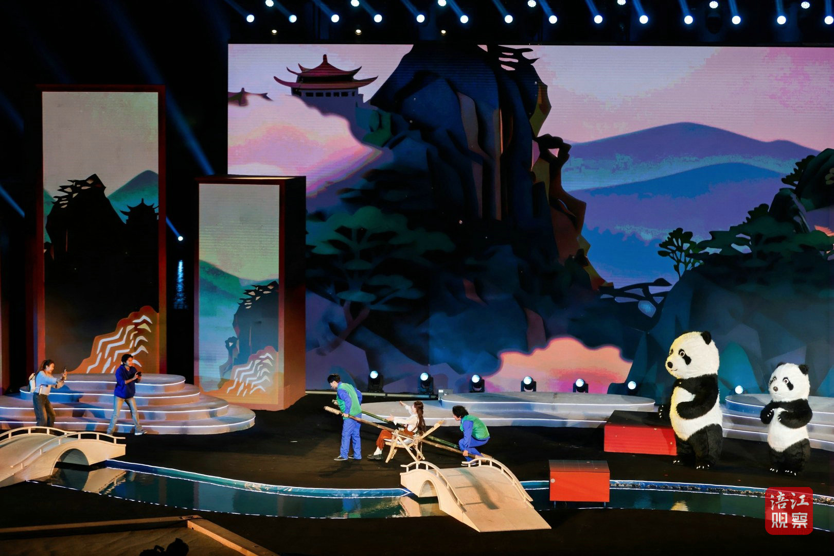 創(chuàng)意舞臺秀《天府十二時辰》以十二時辰為軸,帶領(lǐng)觀眾領(lǐng)略四川十二個旅游目的地的獨特魅力。說書人袁國虎手持折扇,立于三星堆神樹造型的舞臺中央,引領(lǐng)兩只可愛的熊貓“安逸”和“陽陽”開啟時空之旅。