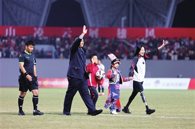 比賽正式開場前,2024年度“中國好人”、全國自強(qiáng)模范、北川姑娘牛鈺,與山東援建北川干部、中國青年志愿服務(wù)銀獎、四川省五四青年獎?wù)芦@得者王鵬來到“川超”綿陽主場,作為開球嘉賓為比賽開球。