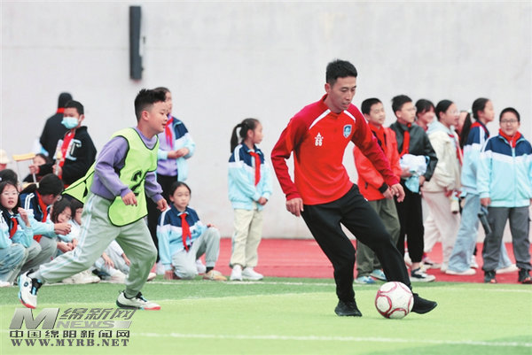 隨后,裁判員、運(yùn)動(dòng)員代表進(jìn)行了宣誓。現(xiàn)場,九洲長虹隊(duì)球員錢虹君親自為比賽開球,他還與學(xué)生們親切互動(dòng),現(xiàn)場演示顛球技巧,耐心指導(dǎo)孩子們?nèi)绾慰刂魄虻墓?jié)奏和力度。孩子們紛紛圍在他身邊,認(rèn)真聆聽、仔細(xì)模仿。不僅如此,錢虹君還參與到班級(jí)間的踢球比賽中,與孩子們同場競技,歡聲笑語回蕩在整個(gè)校園?! ?/p>