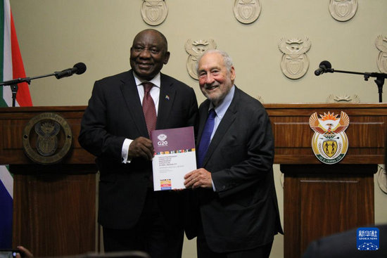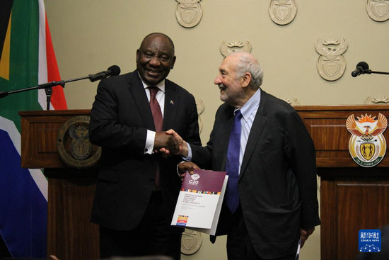 11月4日,在南非立法首都開普敦,二十國集團應(yīng)對全球不平等問題特別獨立專家委員會主席、諾貝爾經(jīng)濟學(xué)獎得主約瑟夫·施蒂格利茨(右)向南非總統(tǒng)拉馬福薩提交關(guān)于全球不平等問題的報告。新華社發(fā)(沙姬拉·泰比攝)