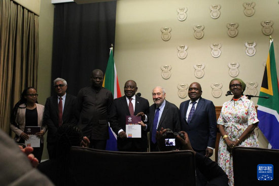 11月4日,在南非立法首都開普敦,二十國集團應(yīng)對全球不平等問題特別獨立專家委員會主席、諾貝爾經(jīng)濟學(xué)獎得主約瑟夫·施蒂格利茨(右三)和專家委員會成員向南非總統(tǒng)拉馬福薩(右四)提交關(guān)于全球不平等問題的報告。新華社發(fā)(沙姬拉·泰比攝)