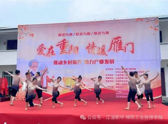 活動中,雁門關村民與江油職中師生同臺獻藝,16個節(jié)目依次上演。江油職中師生精心準備的兩個節(jié)目成為全場亮點——24級舞蹈班11名同學以精湛舞技演繹古典舞《寒依疏影》,展現(xiàn)傳統(tǒng)文化韻味;23級舞蹈班3名同學則以充滿活力的《風吟民族》傳遞民族風情。同學們用舞姿傳遞敬意,以青春感染銀齡,展現(xiàn)出職教學生不僅技能扎實,更懷揣社會責任與感恩之心。節(jié)目贏得了全場陣陣掌聲,場面溫馨動人。
