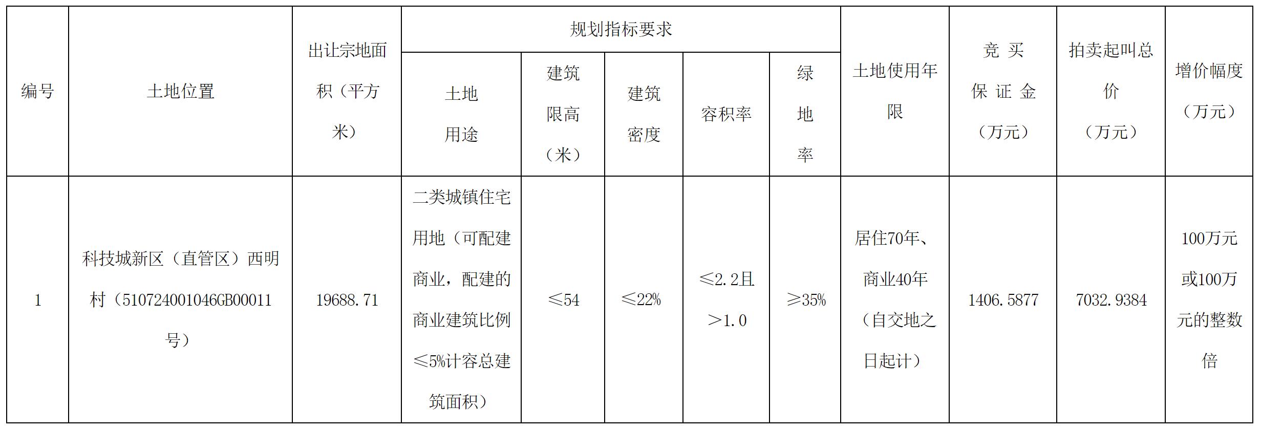 經(jīng)綿陽市人民政府批準,綿陽科技城新區(qū)管理委員會決定以拍賣方式出讓一宗國有建設用地使用權,綿陽市公共資源交易服務中心具體組織實施本次拍賣出讓活動,現(xiàn)將有關事項公告如下: