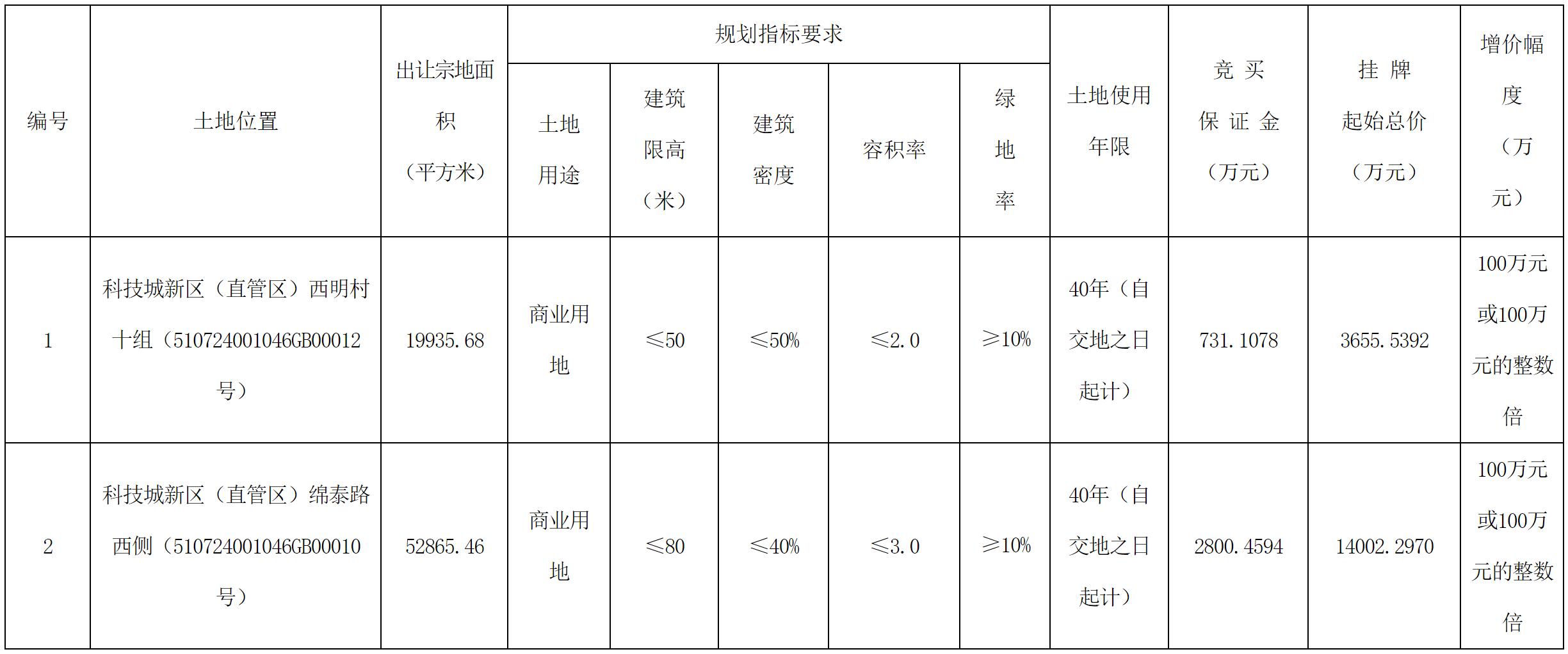 經(jīng)綿陽市人民政府批準,綿陽科技城新區(qū)管理委員會決定以掛牌方式出讓兩宗國有建設用地使用權,綿陽市公共資源交易服務中心具體組織實施本次掛牌出讓活動,現(xiàn)將有關事項公告如下: