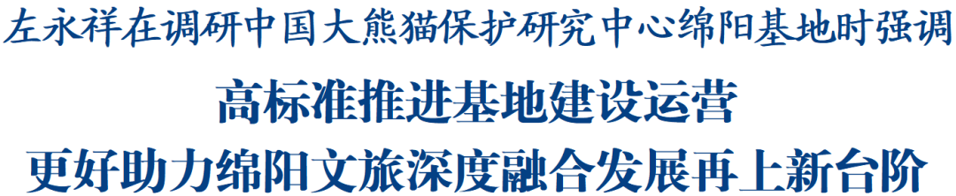調(diào)研過(guò)程中,左永祥強(qiáng)調(diào),中國(guó)大熊貓保護(hù)研究中心綿陽(yáng)基地肩負(fù)著物種保護(hù)、科普研學(xué)、生態(tài)體驗(yàn)等重要職能,也是綿陽(yáng)文旅融合的靚麗名片。要以綿陽(yáng)基地建成運(yùn)營(yíng)為契機(jī),講好大熊貓故事、做好大熊貓文章,推動(dòng)“MyPanda”大熊貓文化IP深度融入“青睞綿陽(yáng) 熊貓有約”文旅品牌建設(shè),謀劃推出更多具有熊貓?jiān)氐男聢?chǎng)景新業(yè)態(tài)新產(chǎn)品,走出一條具有綿陽(yáng)特色的文旅深度融合發(fā)展新路子。要深入挖掘大熊貓文化內(nèi)涵,結(jié)合王朗自然保護(hù)區(qū)等周邊資源,精心設(shè)計(jì)科普內(nèi)容和互動(dòng)體驗(yàn)項(xiàng)目,積極融入“大九寨”等文旅品牌建設(shè),強(qiáng)化全方位、多角度、立體化宣傳推廣,吸引更多人來(lái)消費(fèi)、旅游。要強(qiáng)化科研和人才支撐,依托中國(guó)大熊貓保護(hù)研究中心,深入開(kāi)展大熊貓和伴生瀕危野生動(dòng)物保護(hù)科學(xué)研究,做好大熊貓飼養(yǎng)繁育、疾病防控、野外救護(hù)、調(diào)查監(jiān)測(cè)等工作,推動(dòng)更高水平的大熊貓保護(hù),更好助力大熊貓國(guó)家公園高質(zhì)量建設(shè)。