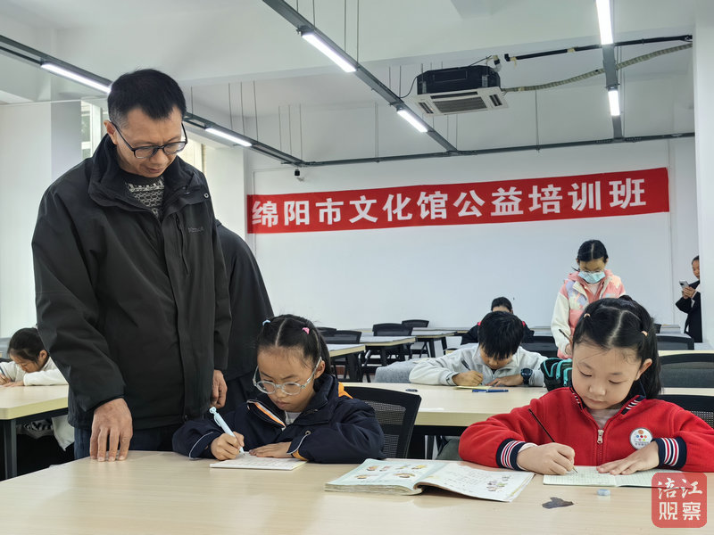 在三樓書法培訓室的書法精進體驗班,綿陽市文化館工作人員曹文龍正在輔導小朋友硬筆書法、毛筆書法,從書寫的手姿、坐姿、筆法技巧等進行示范講解。老師講得仔細,小朋友們練得認真,現(xiàn)場圍觀的家長都拿出手機記錄下了這個畫面。