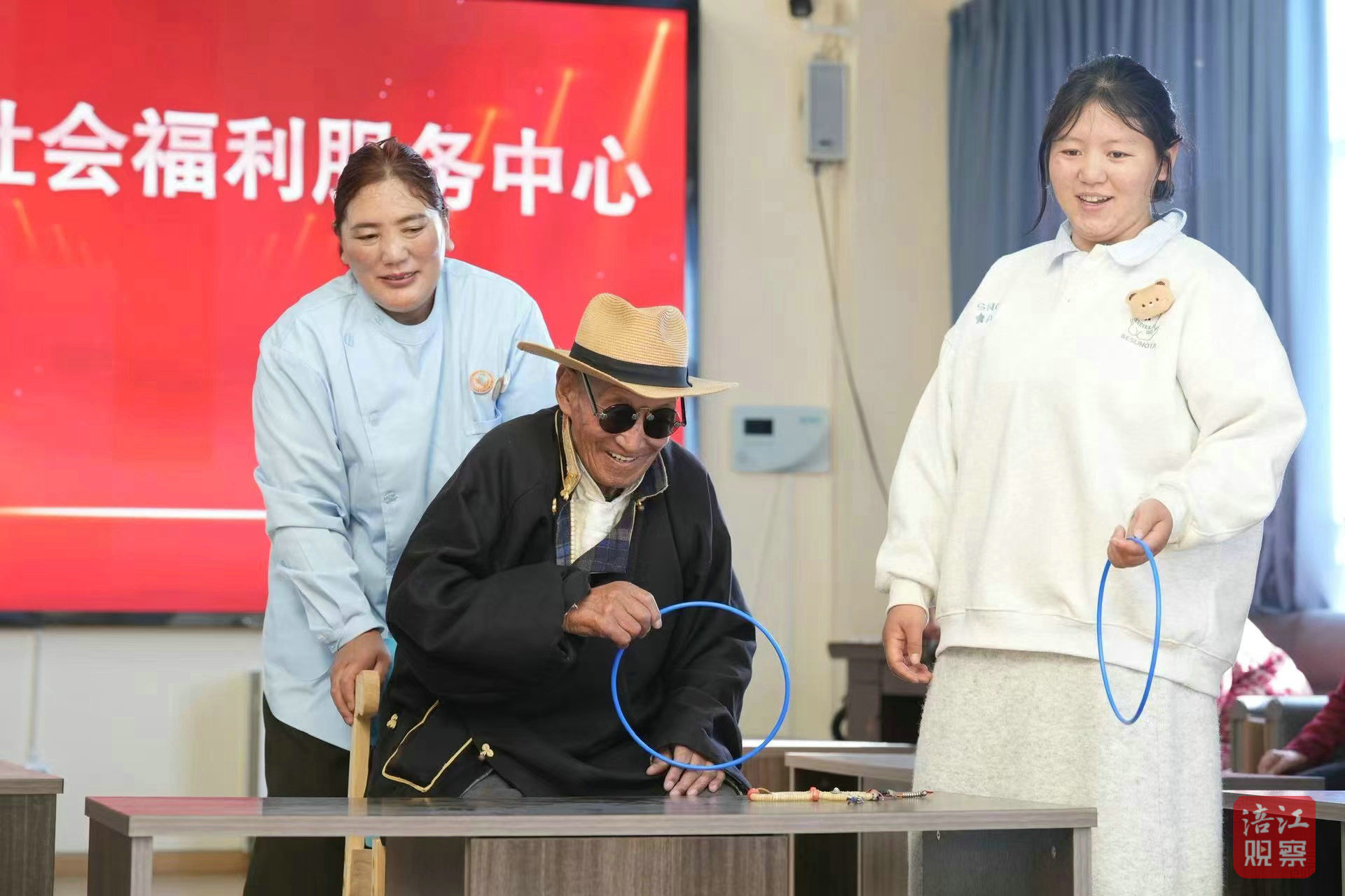 “卡卓扎西(謝謝吉祥)。我是個(gè)孤寡老人,是國(guó)家給我這么好的生活。這邊的條件好,吃穿好,護(hù)工也對(duì)我們很好,很感謝你們!福利院好得很。”老人貫洛感慨地說(shuō)。