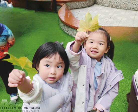 開元實(shí)驗(yàn)幼兒園的孩子展示五彩斑斕的樹葉。 記者 李錦輝 攝
