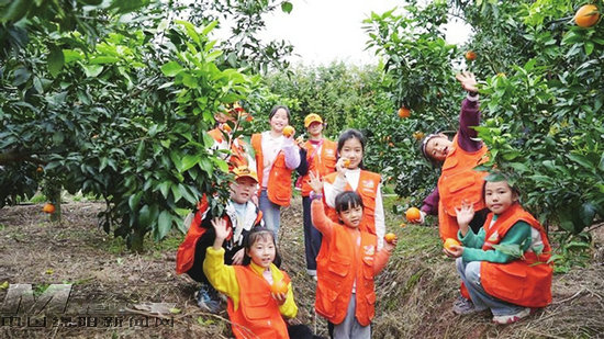 “橙園課堂”上,老師教孩子們通過顏色、手感和重量判斷橘子成熟度。講解完畢,孩子們分工合作,高個(gè)子摘高處果實(shí),矮個(gè)子撿低處橘子,果園里滿是驚喜的呼喊。
