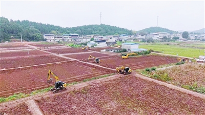 金石鎮(zhèn)三秀村,大型機械實施“小田”變“大田”改造。 記者 李春梅 攝