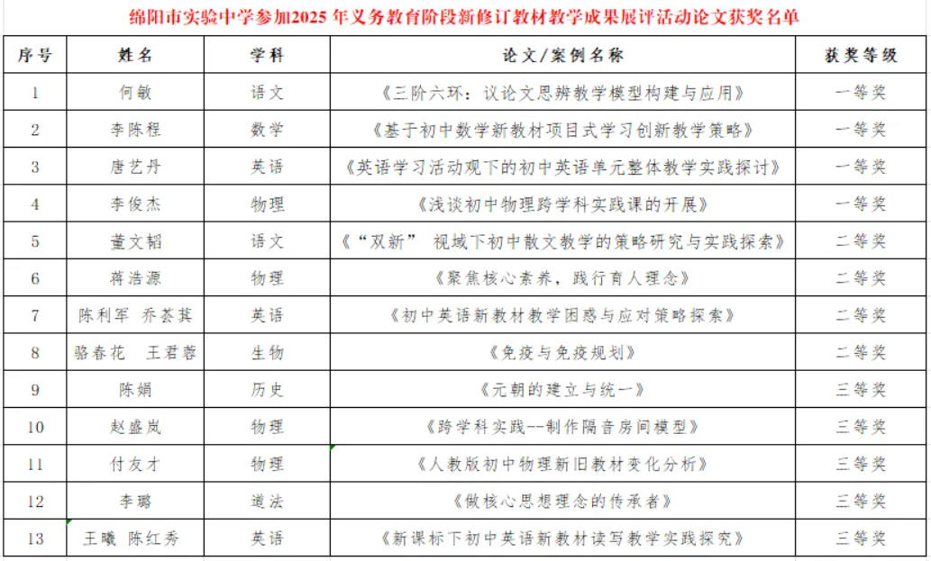 綿陽新聞網(wǎng)訊 11月7日,由綿陽市教育科學研究所精心組織的2025年義務(wù)教育階段新修訂教材教學成果展評活動成果揭曉。經(jīng)過評委專家組公開、公平、公正的嚴格評審,綿陽市實驗中學(綿陽七中)多名教師憑借扎實的專業(yè)功底與創(chuàng)新的教學實踐,斬獲多項大獎,成果豐碩。