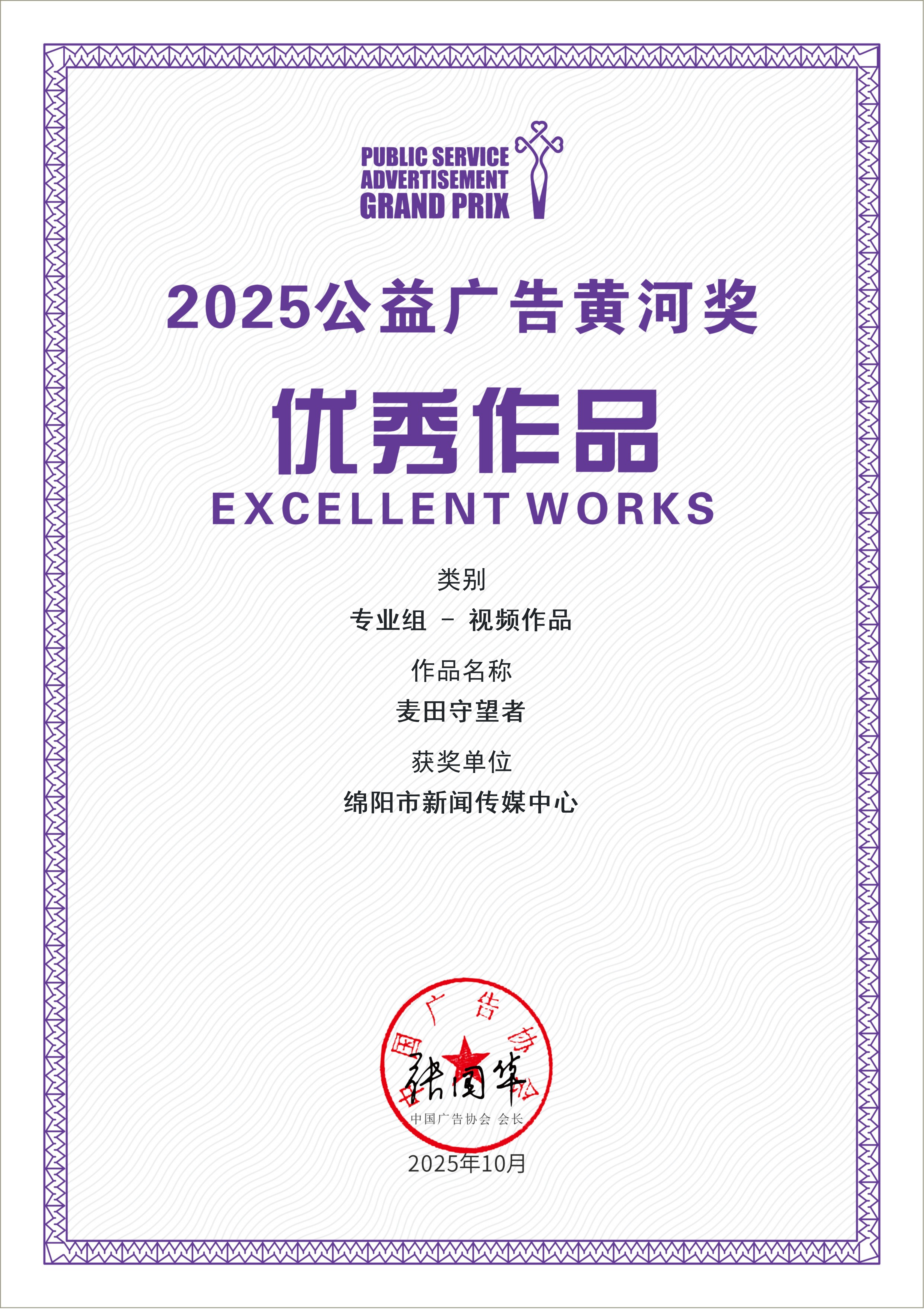 近日,2025公益廣告黃河獎(jiǎng)?lì)C獎(jiǎng)典禮在青島舉行。由綿陽(yáng)市新聞傳媒中心“益心向陽(yáng)”公益廣告工作室創(chuàng)作的公益廣告短片《麥田守望者》榮獲專業(yè)組優(yōu)秀作品獎(jiǎng),標(biāo)志著綿陽(yáng)市新聞傳媒中心在公益廣告創(chuàng)作與傳播領(lǐng)域邁上新臺(tái)階。