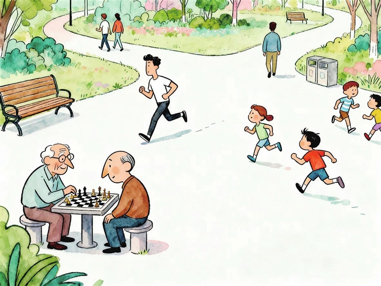 所謂“口袋公園”,既言其袖珍,也喻其方便。它們規(guī)模不大、形狀靈活,可能是街角一塊小型綠地,可能是社區(qū)里的街心花園,也可能是配套簡(jiǎn)單設(shè)施的小型運(yùn)動(dòng)場(chǎng)地。在這些“小而美”的“口袋公園”里,老人下棋聊天,年輕人跑步放松,孩子們追逐嬉笑。不必遠(yuǎn)行,詩(shī)意就在家門口,也讓社區(qū)居民真正實(shí)現(xiàn)了“推窗見綠,轉(zhuǎn)角遇景”。