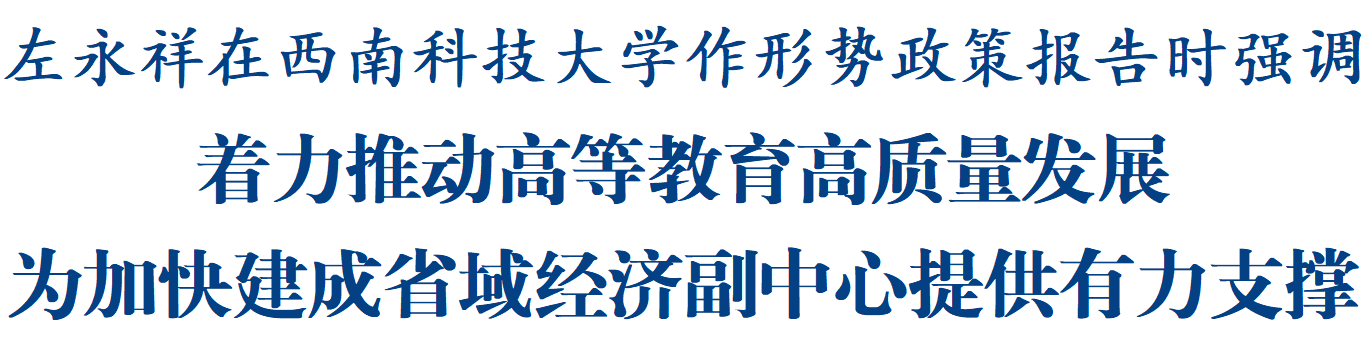 左永祥指出,綿陽是中國唯一科技城、四川第二大經(jīng)濟體、川渝第三城。習(xí)近平總書記對綿陽科技城建設(shè)多次作出重要指示,對科技城發(fā)展寄予殷切期望。國家賦予綿陽科技城加快建設(shè)中國特色社會主義科技創(chuàng)新先行區(qū)的光榮使命。省委、省政府賦予綿陽加快建成省域經(jīng)濟副中心的時代重任。當(dāng)前,綿陽正錨定目標(biāo),把“發(fā)揮中國科技城優(yōu)勢加快建成省域經(jīng)濟副中心”作為推動綿陽高質(zhì)量發(fā)展的總牽引總抓手,大力實施“八大行動”,扎實抓好“四張清單”,努力推動全市經(jīng)濟社會發(fā)展邁上新臺階。希望廣大師生充分認識當(dāng)前綿陽肩負的重大使命和面臨的重大機遇,矢志拼搏奮斗,勇于創(chuàng)新創(chuàng)造,在奮力譜寫中國式現(xiàn)代化綿陽新篇章中成就精彩人生。市委、市政府將一如既往為西南科技大學(xué)廣大師生工作學(xué)習(xí)、干事創(chuàng)業(yè)創(chuàng)造良好條件、提供廣闊舞臺。