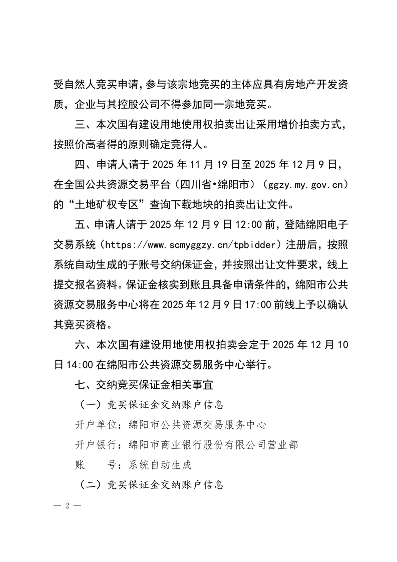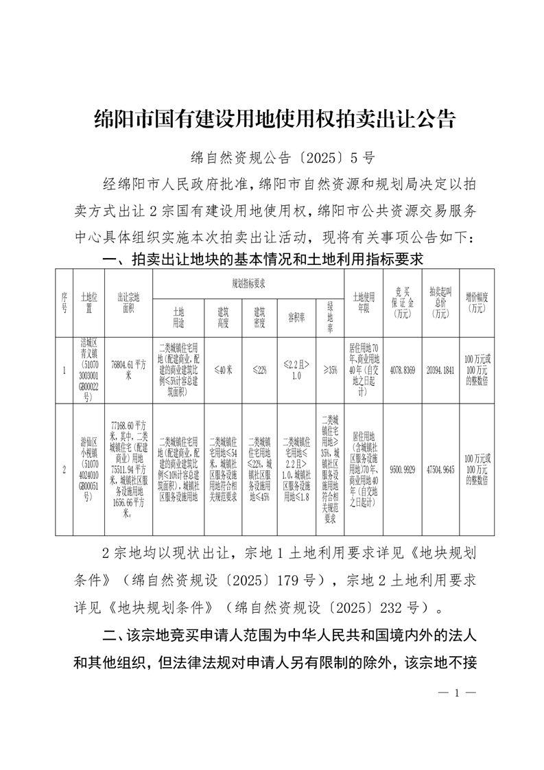 綿陽市國有建設(shè)用地使用權(quán)拍賣出讓公告(綿自然資規(guī)公告〔2025〕5號(hào))