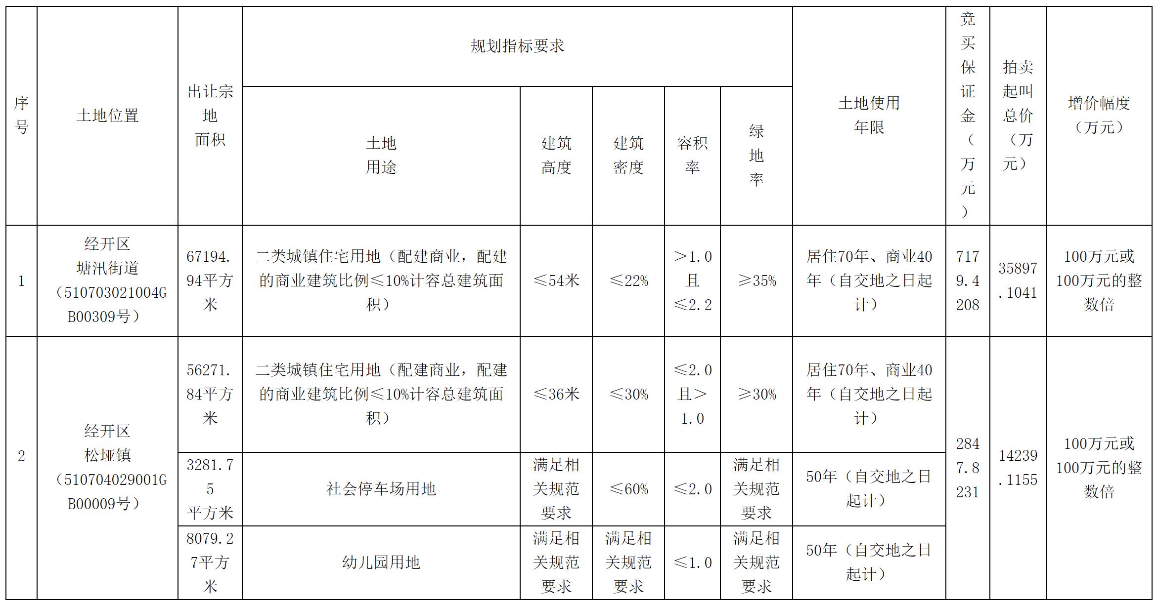 經(jīng)綿陽(yáng)市人民政府批準(zhǔn),綿陽(yáng)經(jīng)濟(jì)技術(shù)開(kāi)發(fā)區(qū)管理委員會(huì)決定以拍賣(mài)方式出讓2宗國(guó)有建設(shè)用地使用權(quán),綿陽(yáng)市公共資源交易服務(wù)中心具體組織實(shí)施本次拍賣(mài)出讓活動(dòng),現(xiàn)將有關(guān)事項(xiàng)公告如下: