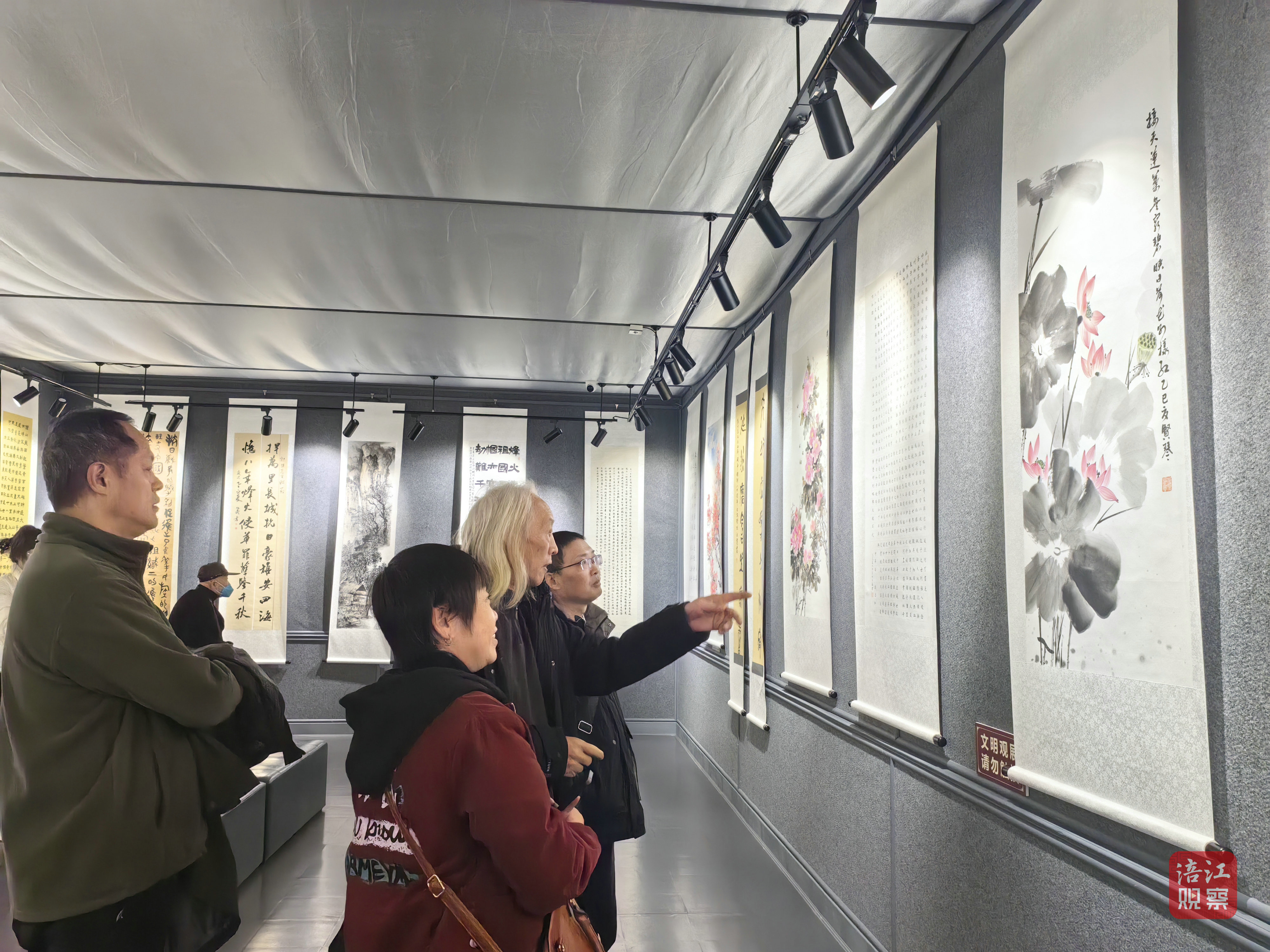 當(dāng)天上午,在簡短的開幕式后,到場的書畫愛好者和游客有序進入展廳。一幅幅風(fēng)格多樣、意境深遠的作品吸引了大家的駐足。參觀者有的就作品的內(nèi)容、技法等進行交流。有的參展作品作者則現(xiàn)場客串解說員,與大家分享創(chuàng)作心得。在展覽現(xiàn)場,不時有參觀者拿出手機拍攝心儀之作,有的還在展出作品前留影。