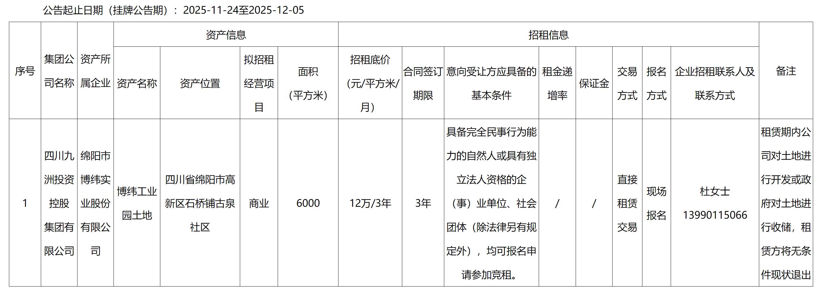 四川九洲千城商業(yè)管理有限公司園區(qū)項(xiàng)目部代管資產(chǎn)出租公告