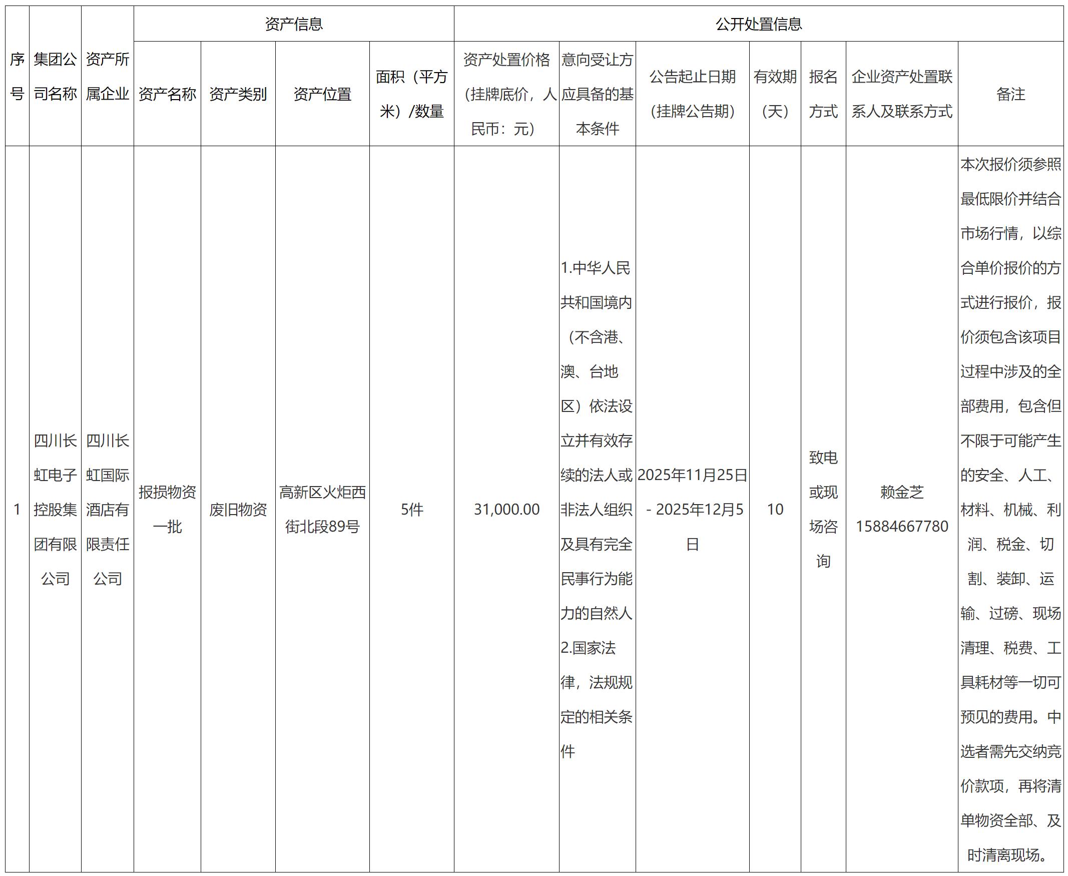 四川長虹國際酒店有限責(zé)任公司資產(chǎn)處置公告